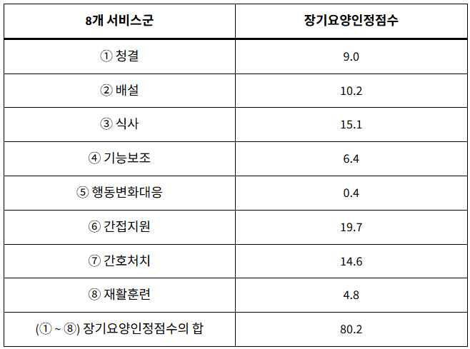 1단계에서 조사한 신청인의 심신 상태를 반영한 52개 항목의 조사 결과와 3단계에서 산출한 영역별 100점 환산 점수를 바탕으로, 이제 8개의 서비스군별로 장기요양인정점수를 산출하는 과정을 진행합니다.