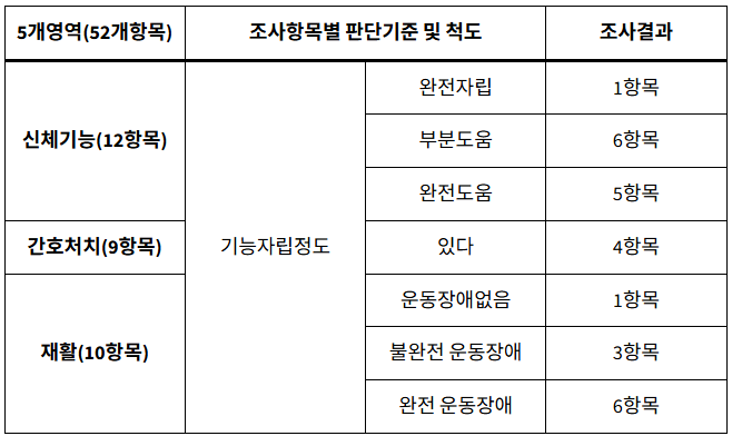조사된 항목 각각은 신청인의 심신 기능 상태를 구체적으로 반영하고 있으며, 다음과 같은 기준으로 점수를 부여합니다.